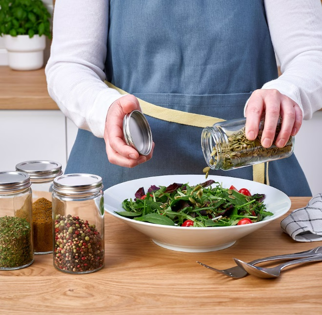 Вместительная банка из прозрачного стекла с завинчивающейся стальной крышкой. Простая и функциональная емкость для специй. Вы также можете использовать ее для джема или в качестве бутылки для сока, чтобы взять с собой и использовать вне дома. Силиконовое уплотнение делает крышку плотно прилегающей и надежно удерживает ее на месте.
