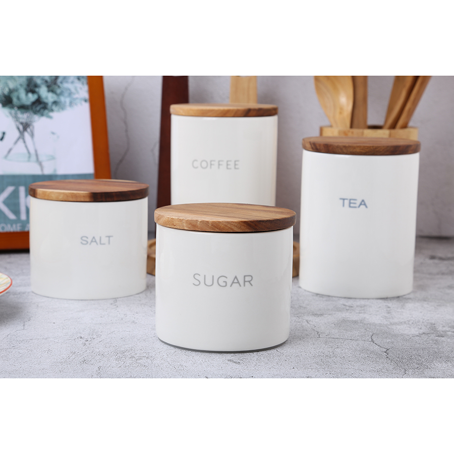 Набор из 4-х керамических банок с деревянными крышками.