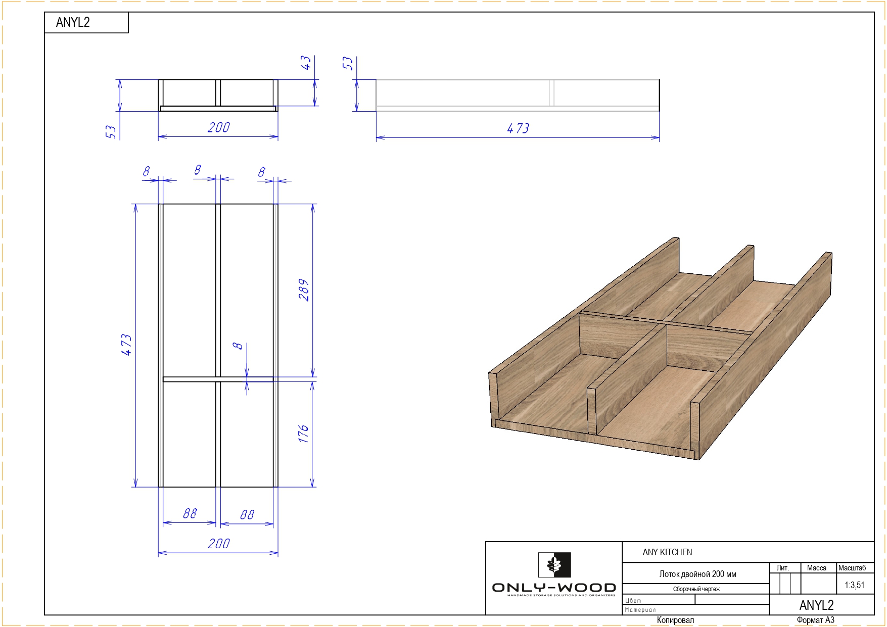 / Лоток двойной 200 мм для столовых приборов дуб рустик