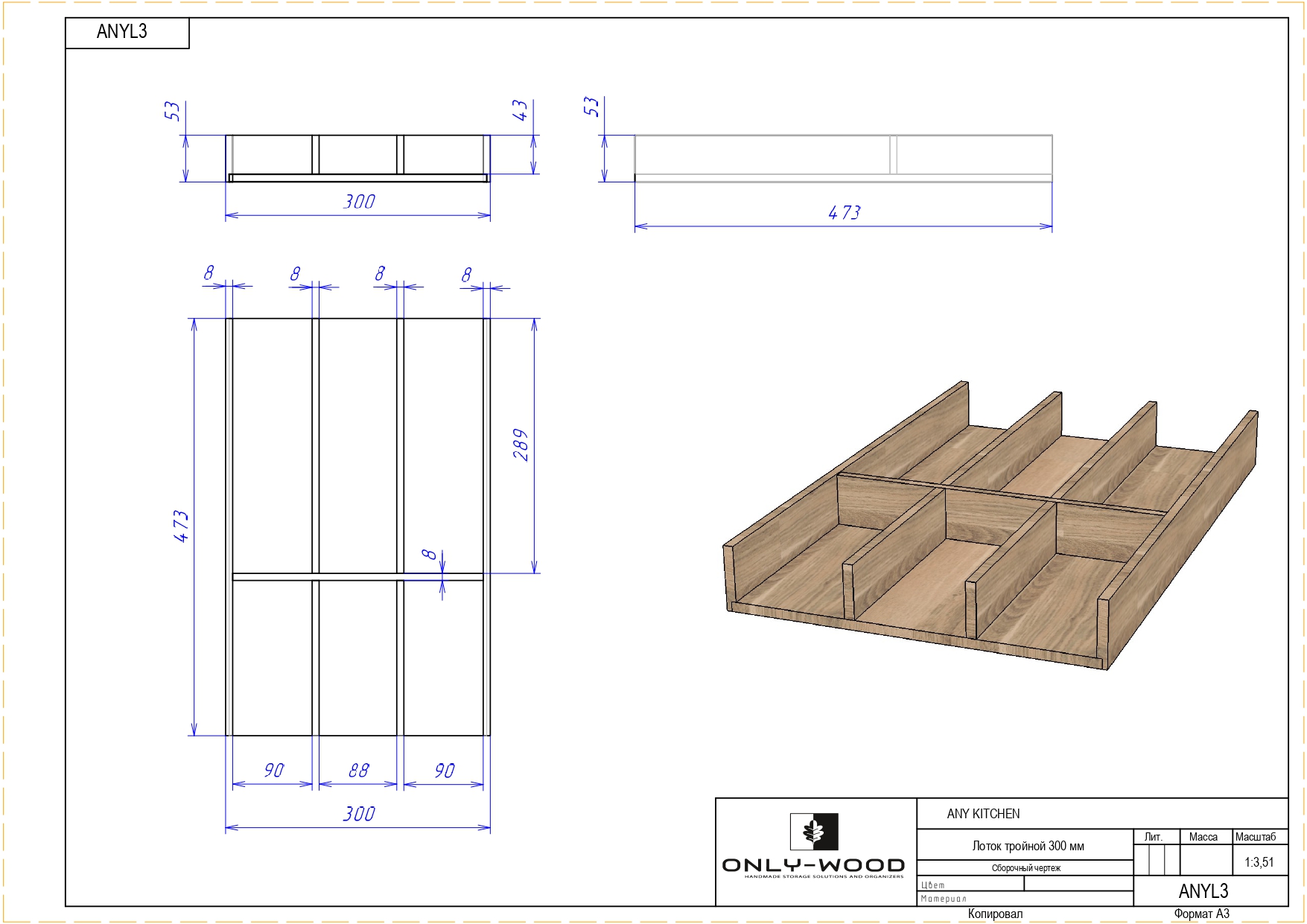 / Лоток тройной 300 мм для столовых приборов дуб белый