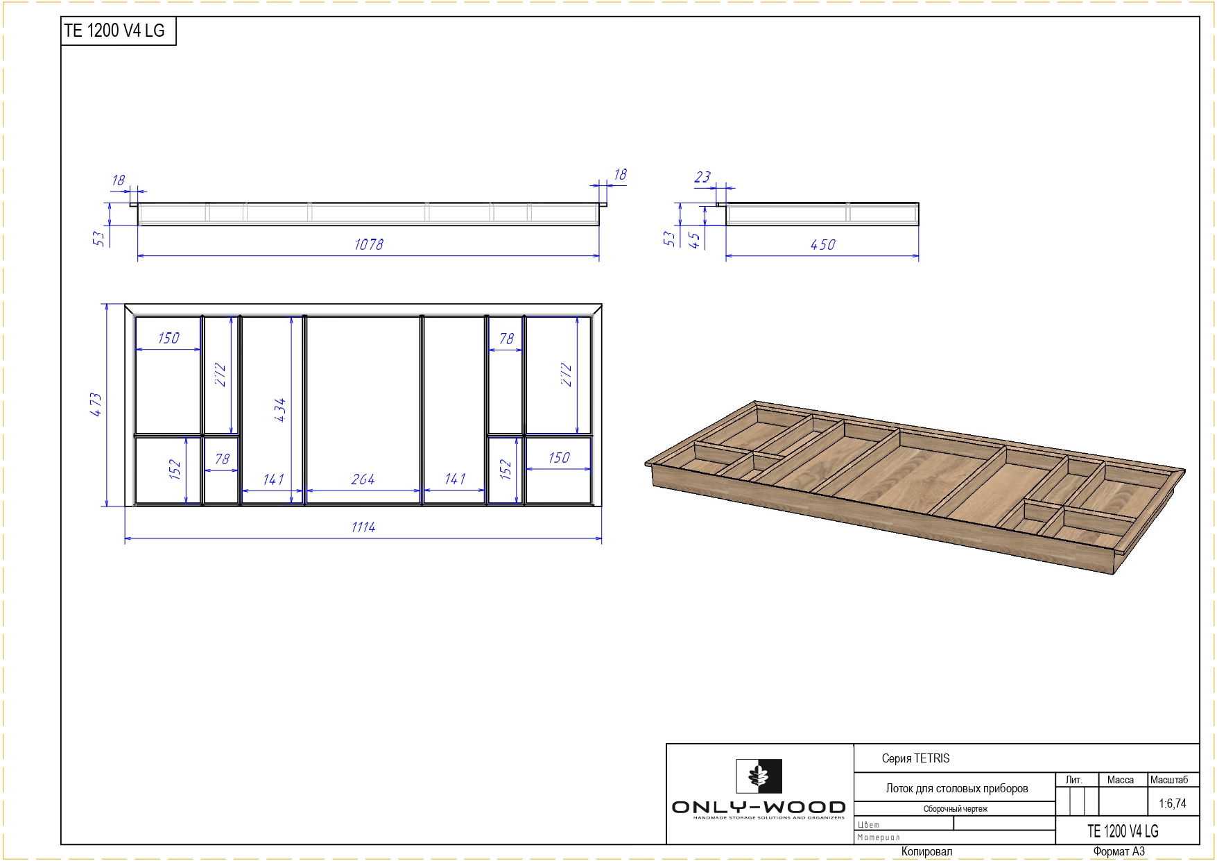 Лоток из натурального дуба, пропитан натуральным маслом и полностью адаптирован для низких выдвижных ящиков глубиной 500 мм.