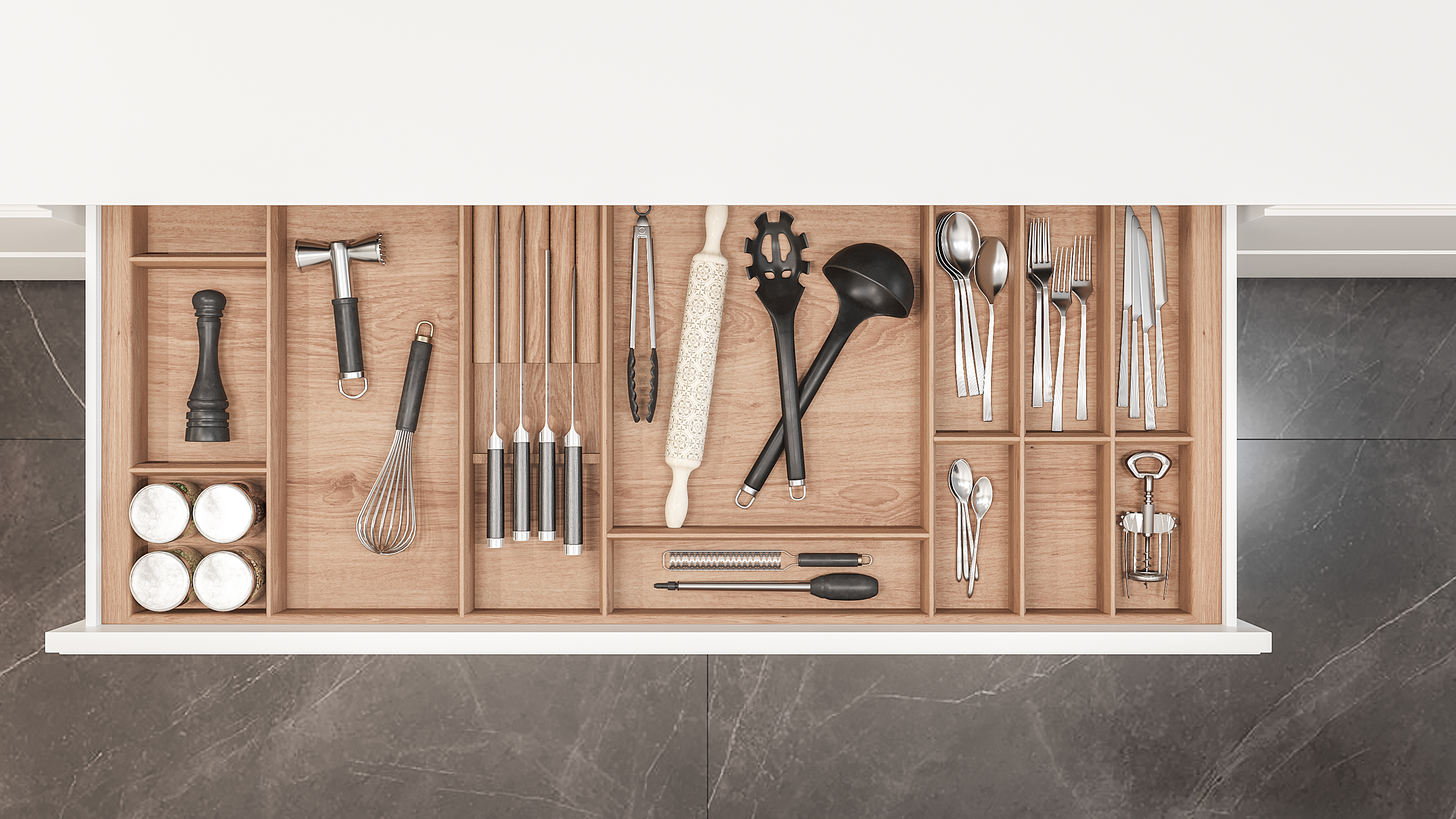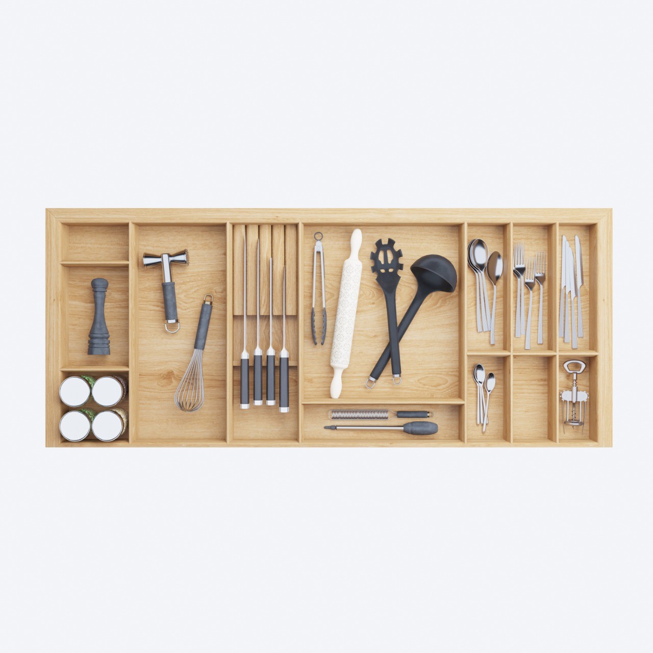 Лоток для столовых приборов в базу 1200 для оснащения низких кухонных ящиков. Элегантный лоток-вкладыш разработан и вручную изготовлен для ящиков разных систем глубиной 500 мм в корпус шириной 1200 мм. Лоток предназначен для хранения столовых приборов и кухонного инвентаря. Лоток изготовлен из высококачественных материалов безопасных в применении на кухне.