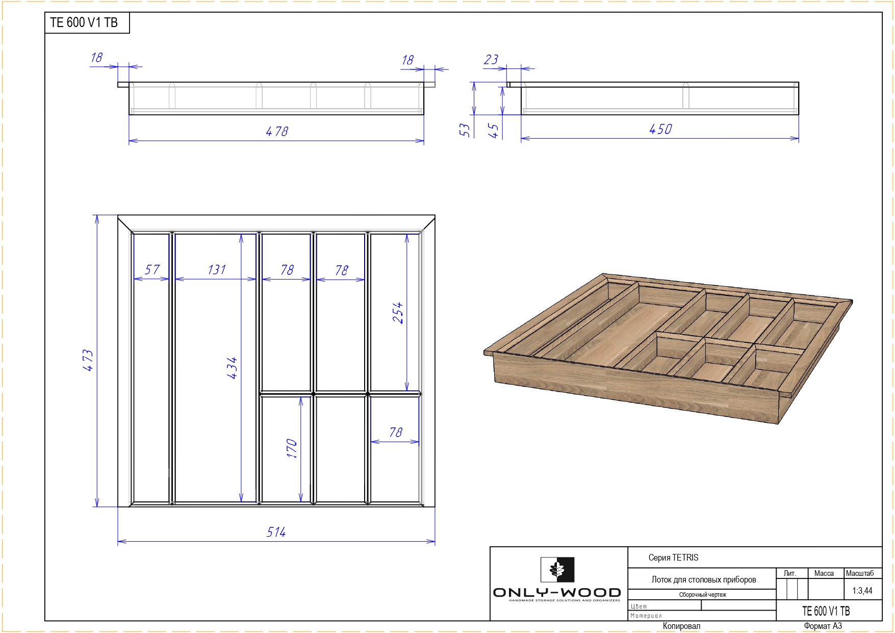 Лоток для столовых приборов в шкаф шириной 600 мм для оснащения низких кухонных ящиков. Элегантный лоток-вкладыш разработан и вручную изготовлен для ящиков разных систем глубиной 500 мм в корпус шириной 600 мм. Лоток предназначен для хранения столовых приборов и кухонного инвентаря. Вы по желанию можете добавить держатели ножей и специй. Лоток изготовлен из высококачественных материалов безопасных в применении на кухне.