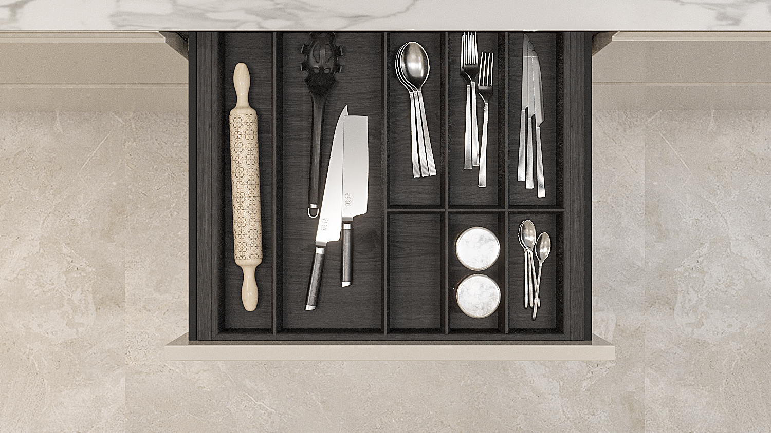 Современный дизайн – прямоугольные формы и четкие линии, суженные сверху разделители идеально сочетаются с последними новинками выдвижных ящиков.