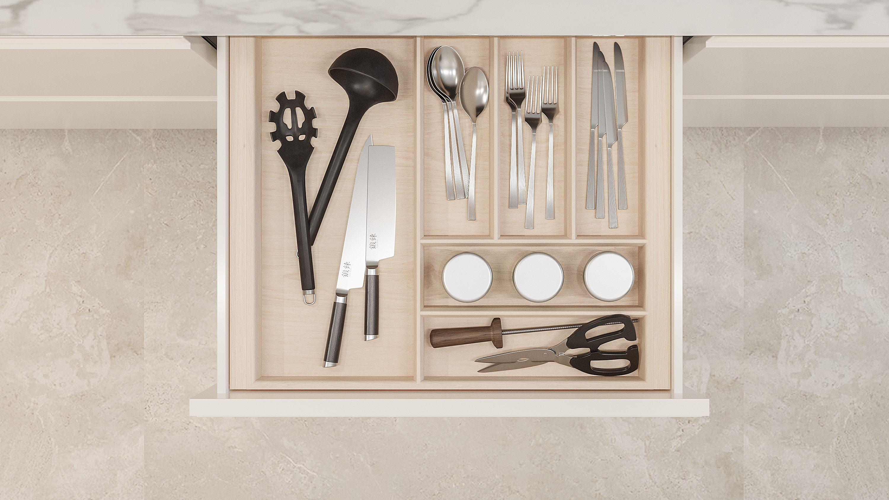 Лоток для столовых приборов в базу 600 для оснащения низких кухонных ящиков. Элегантный лоток-вкладыш разработан и вручную изготовлен для ящиков разных систем глубиной 500 мм в корпус шириной 600 мм. Лоток предназначен для хранения столовых приборов и кухонного инвентаря. Вы по желанию можете добавить держатели ножей и специй. Лоток изготовлен из высококачественных материалов безопасных в применении на кухне.