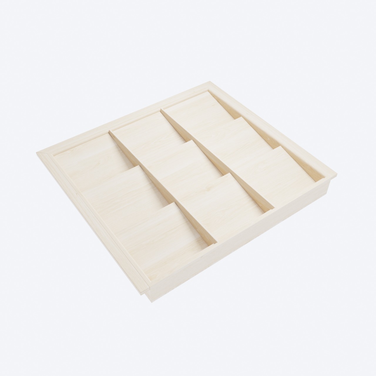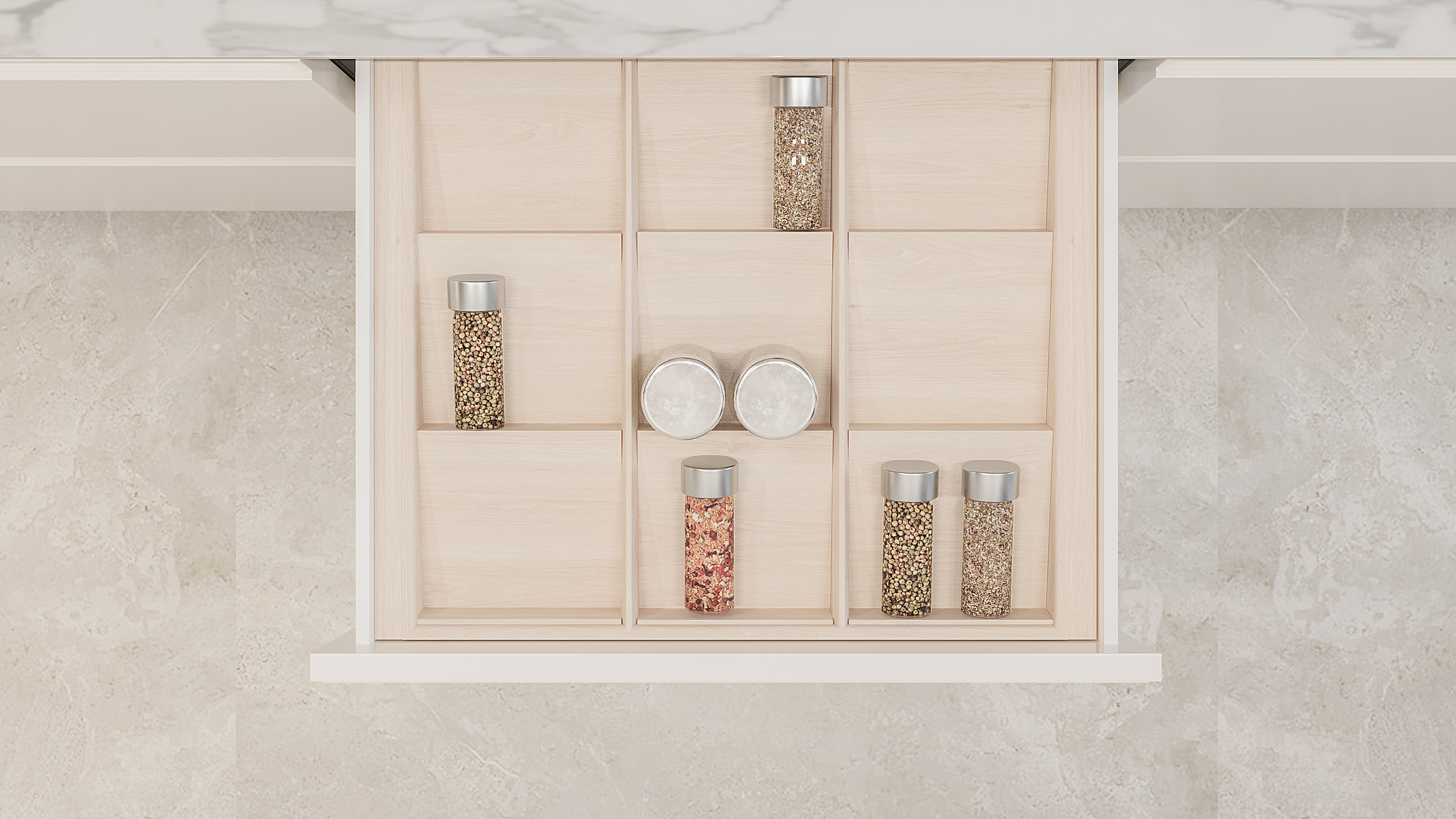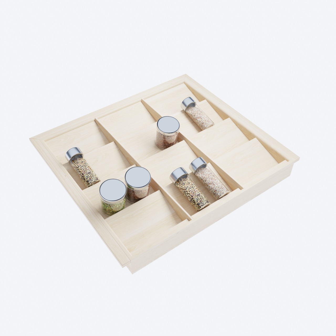 Деревянный лоток TETRIS V6 на 3 уровня для специй из массива дуба в низкий выдвижной ящик глубиной 500 мм для ширины фасада 600 мм, цвет дуб белый.