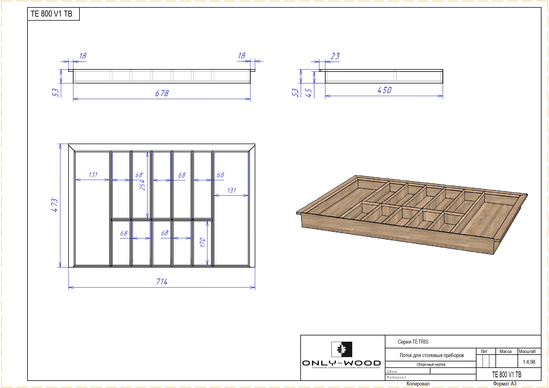 Лоток из натурального дуба, пропитан натуральным маслом и полностью адаптирован для низких выдвижных ящиков глубиной 500 мм.