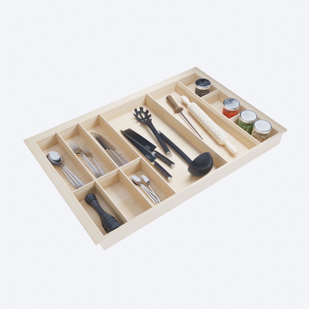 Лоток для столовых приборов в базу 800 для оснащения низких кухонных ящиков. Элегантный лоток-вкладыш разработан и вручную изготовлен для ящиков разных систем глубиной 500 мм в корпус шириной 800 мм. Лоток предназначен для хранения столовых приборов и кухонного инвентаря. Вы по желанию можете добавить держатели ножей и специй. Лоток изготовлен из высококачественных материалов безопасных в применении на кухне.