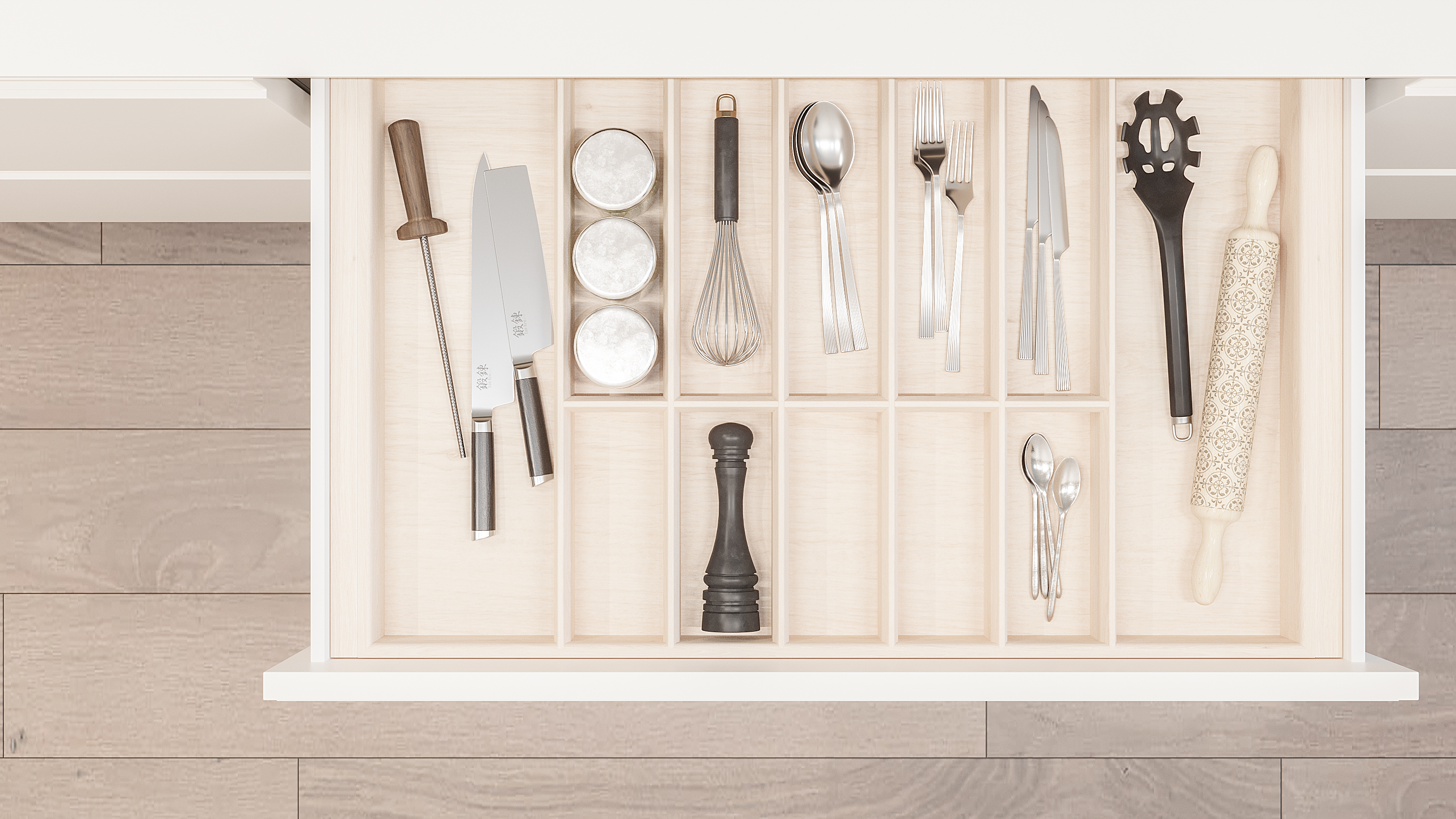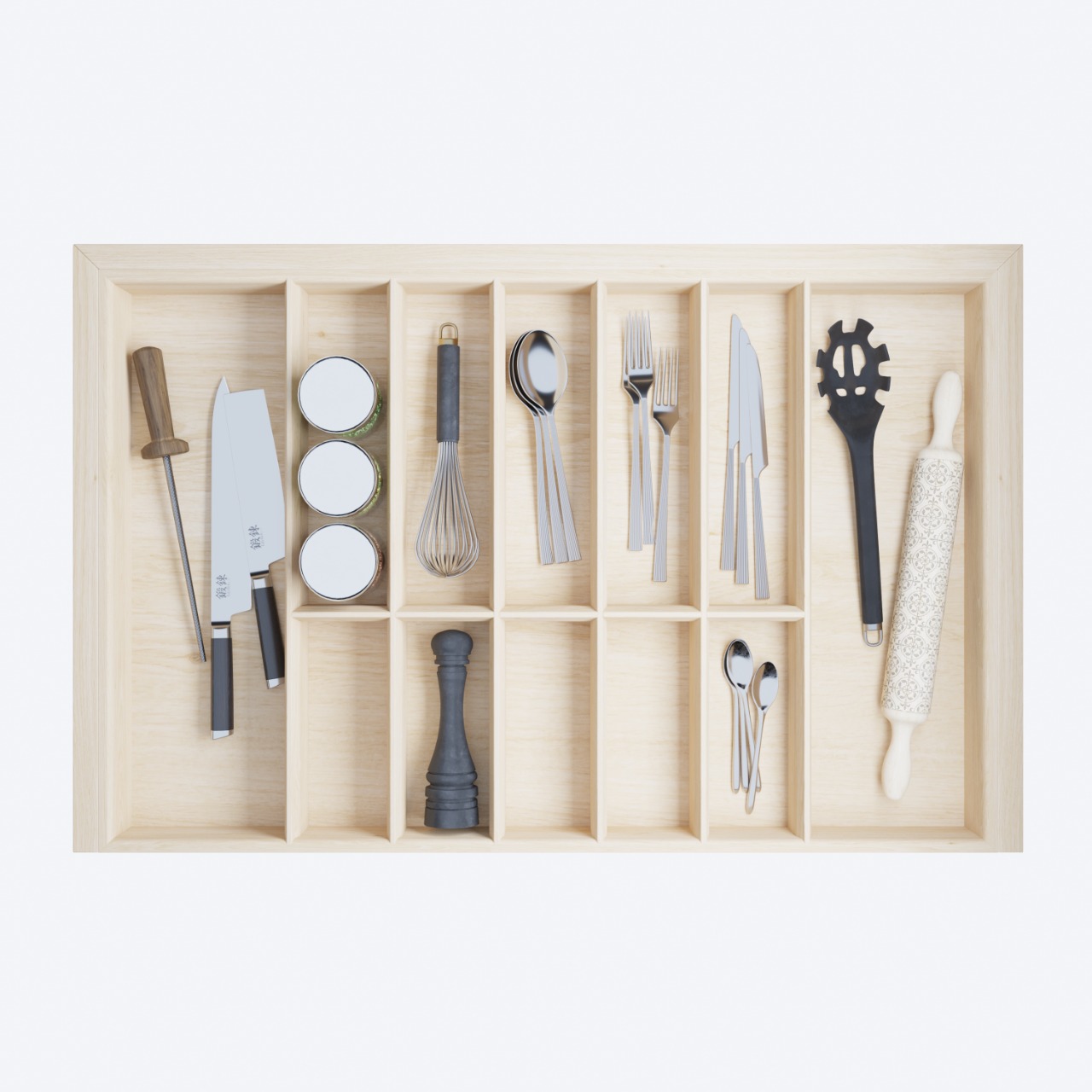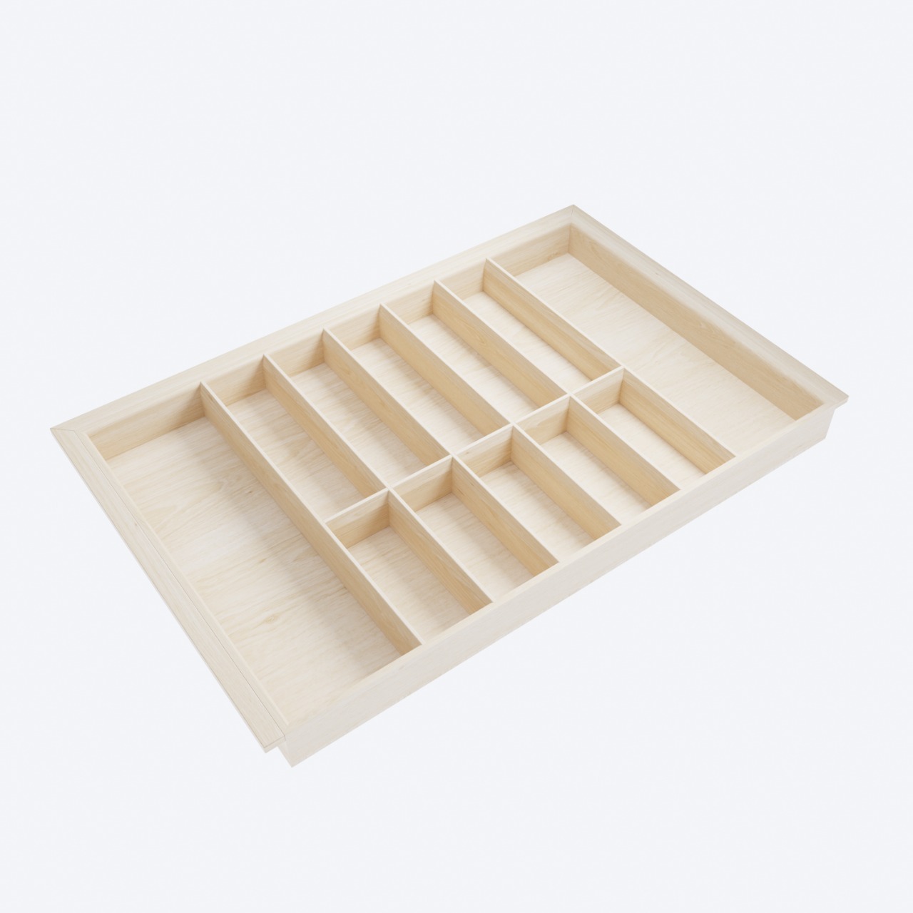 Лоток для столовых приборов в базу 800 для оснащения низких кухонных ящиков. Элегантный лоток-вкладыш разработан и вручную изготовлен для ящиков разных систем глубиной 500 мм в корпус шириной 800 мм. Лоток предназначен для хранения столовых приборов и кухонного инвентаря. Вы по желанию можете добавить держатели ножей и специй. Лоток изготовлен из высококачественных материалов безопасных в применении на кухне.