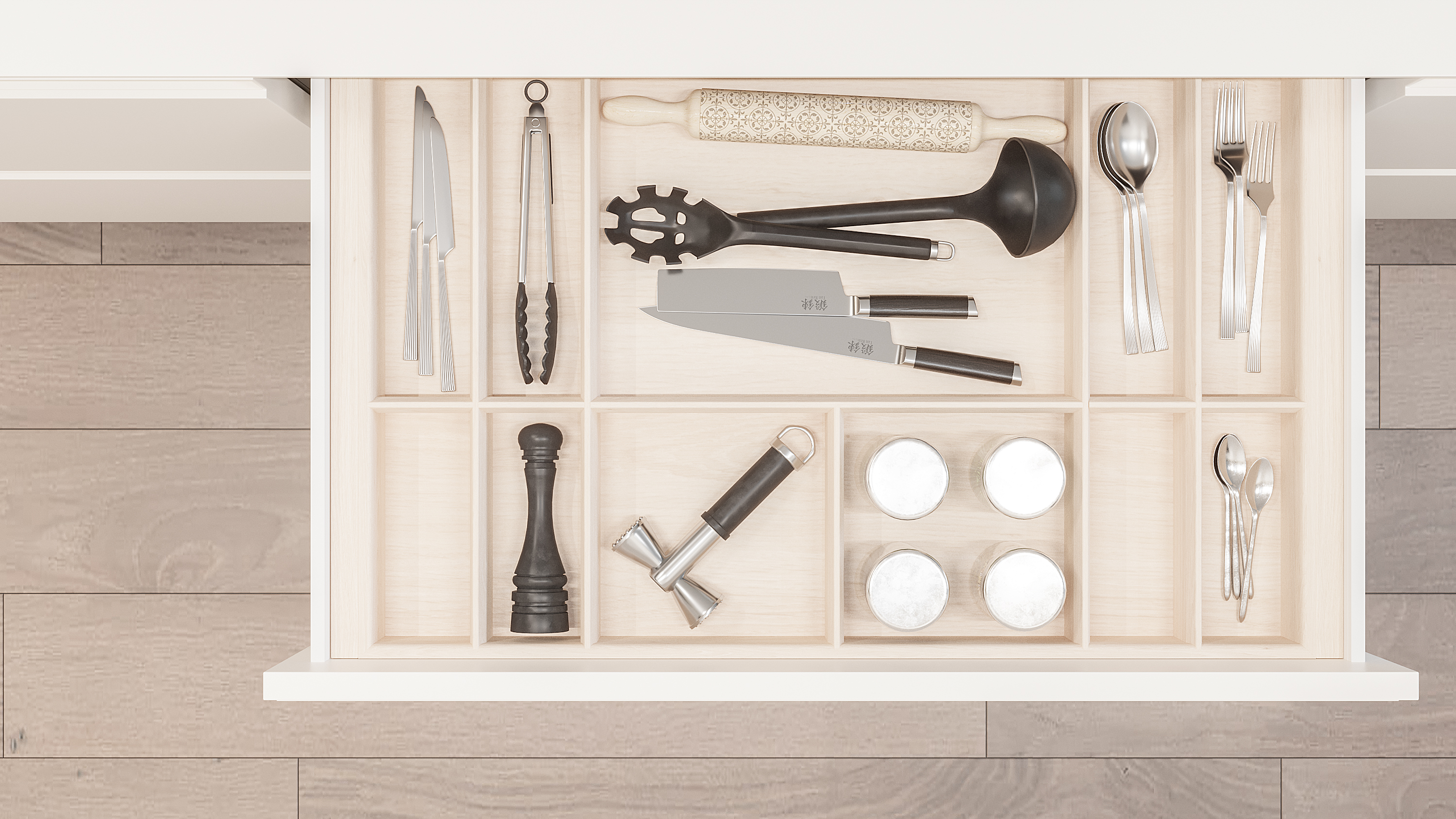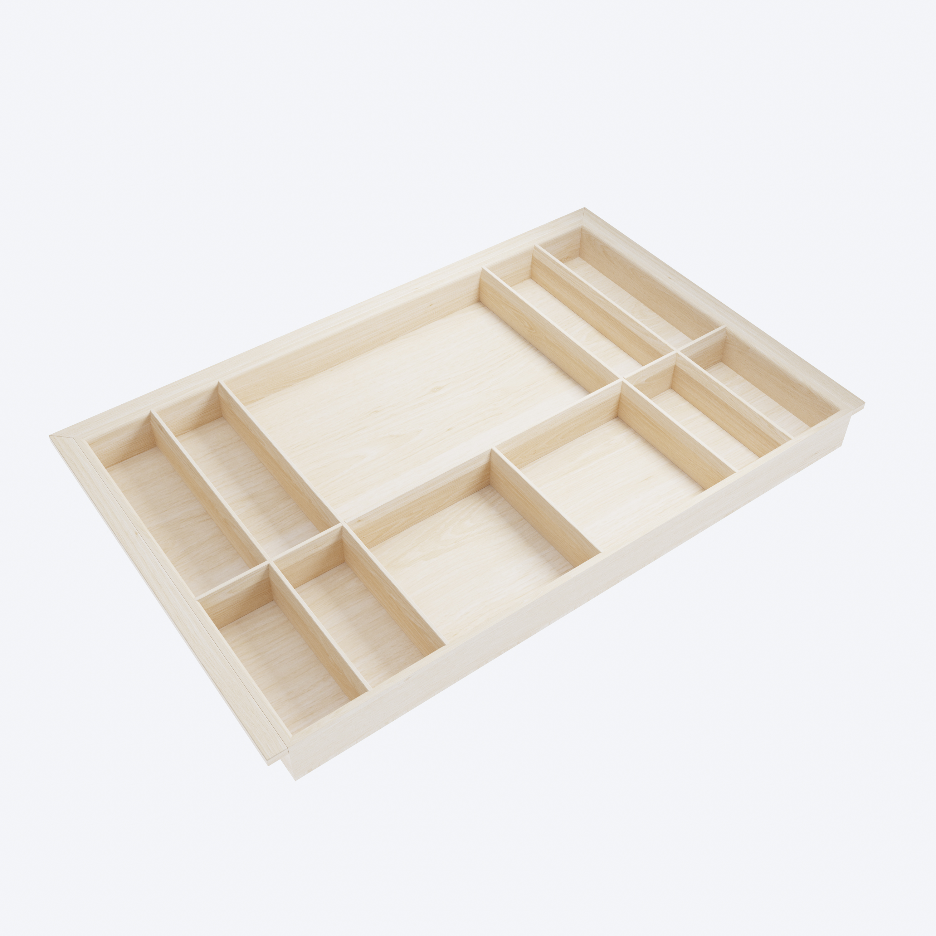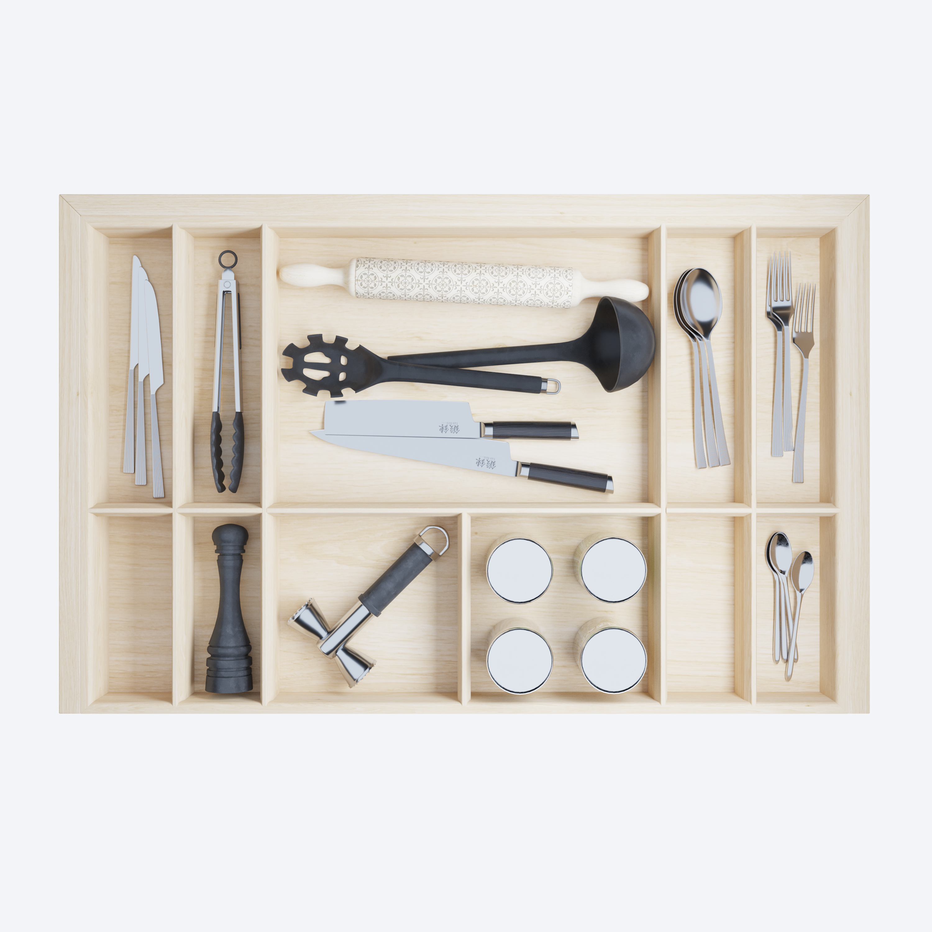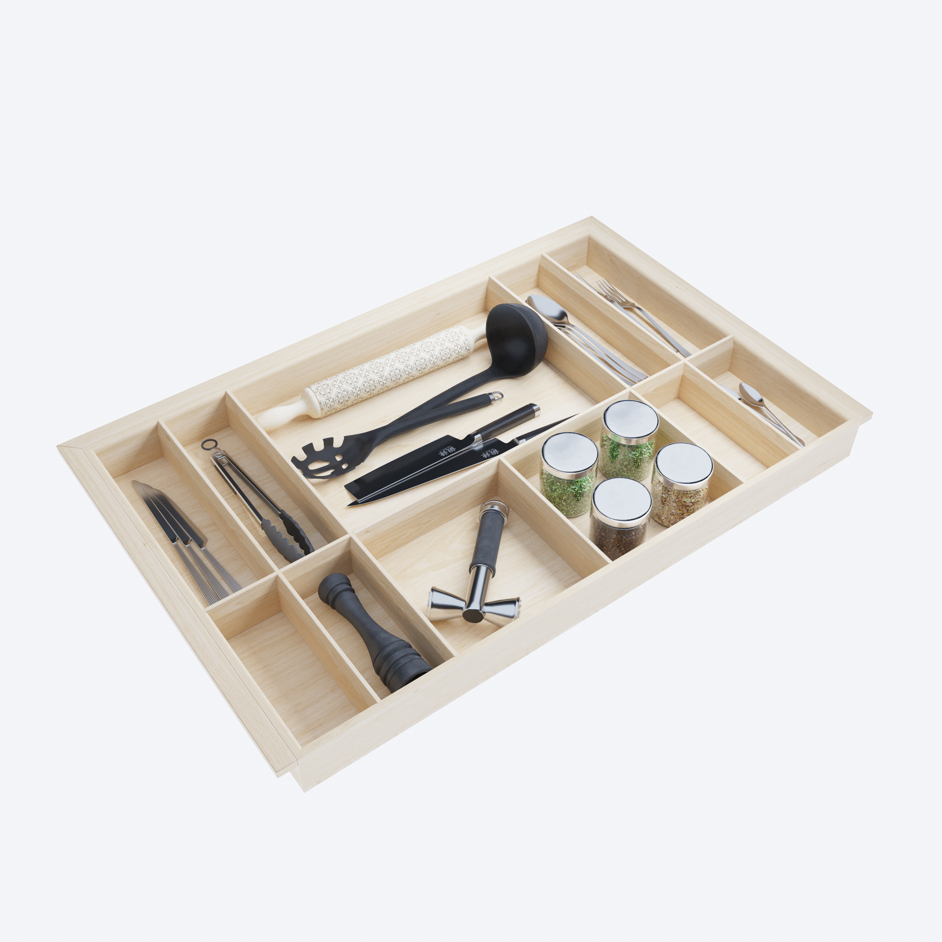Лоток для столовых приборов в базу 800 для оснащения низких кухонных ящиков. Элегантный лоток-вкладыш разработан и вручную изготовлен для ящиков разных систем глубиной 500 мм в корпус шириной 800 мм. Лоток предназначен для хранения столовых приборов и кухонного инвентаря. Вы по желанию можете добавить держатели ножей и специй. Лоток изготовлен из высококачественных материалов безопасных в применении на кухне.Лоток из натурального дуба, пропитан натуральным маслом и полностью адаптирован для низких выдвижных ящиков глубиной 500 мм.