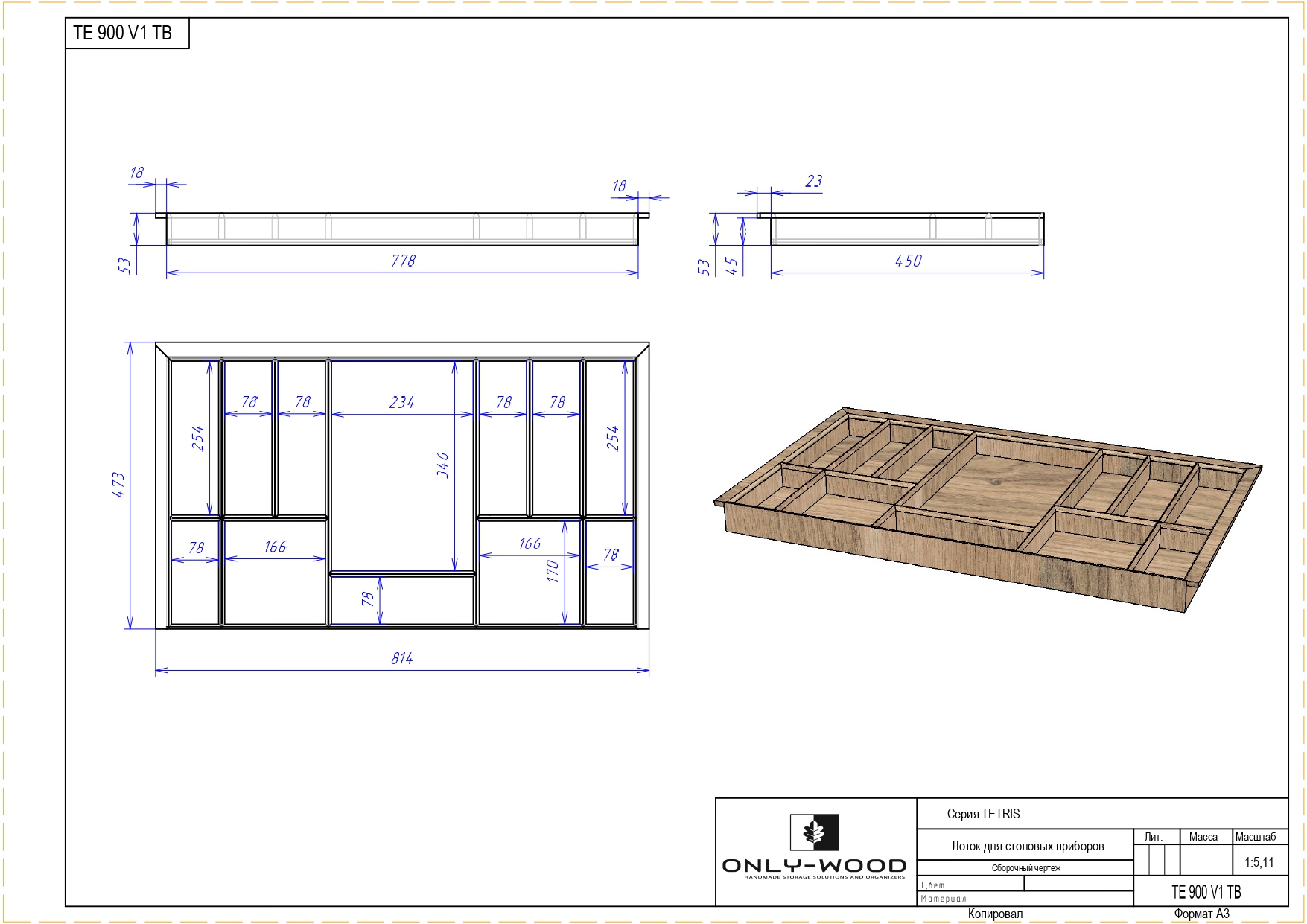 Лоток из натурального дуба, пропитан натуральным маслом и полностью адаптирован для низких выдвижных ящиков глубиной 500 мм.