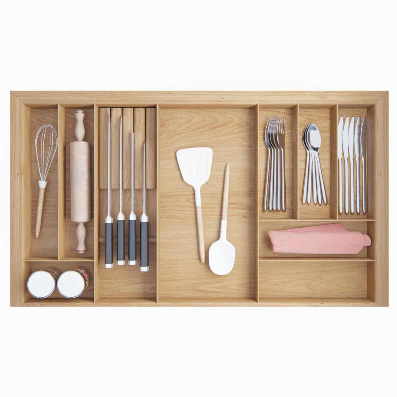Лоток для столовых приборов в базу 900 для оснащения низких кухонных ящиков. Элегантный лоток-вкладыш разработан и вручную изготовлен для ящиков разных систем глубиной 500 мм в корпус шириной 900 мм. Лоток предназначен для хранения столовых приборов и кухонного инвентаря. Вы по желанию можете добавить держатели ножей и специй. Лоток изготовлен из высококачественных материалов безопасных в применении на кухне.