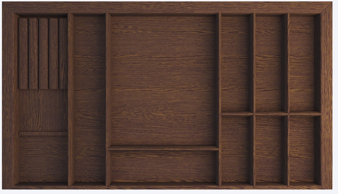 Лоток из натурального дуба под лаком адаптирован для низких выдвижных ящиков глубиной 500 мм.