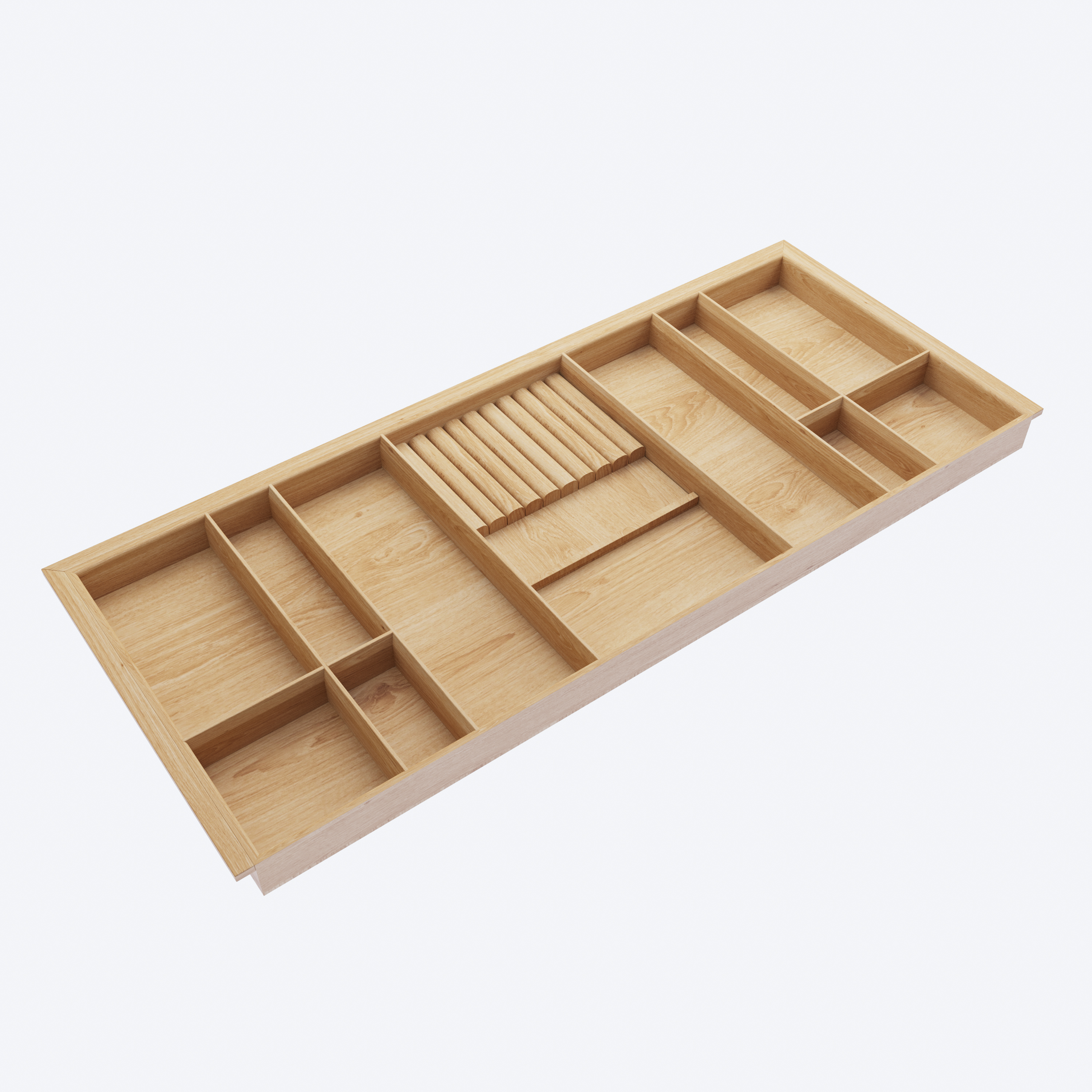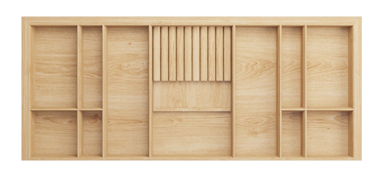 Лоток из натурального дуба, пропитан натуральным маслом и полностью адаптирован для низких выдвижных ящиков глубиной 500 мм.