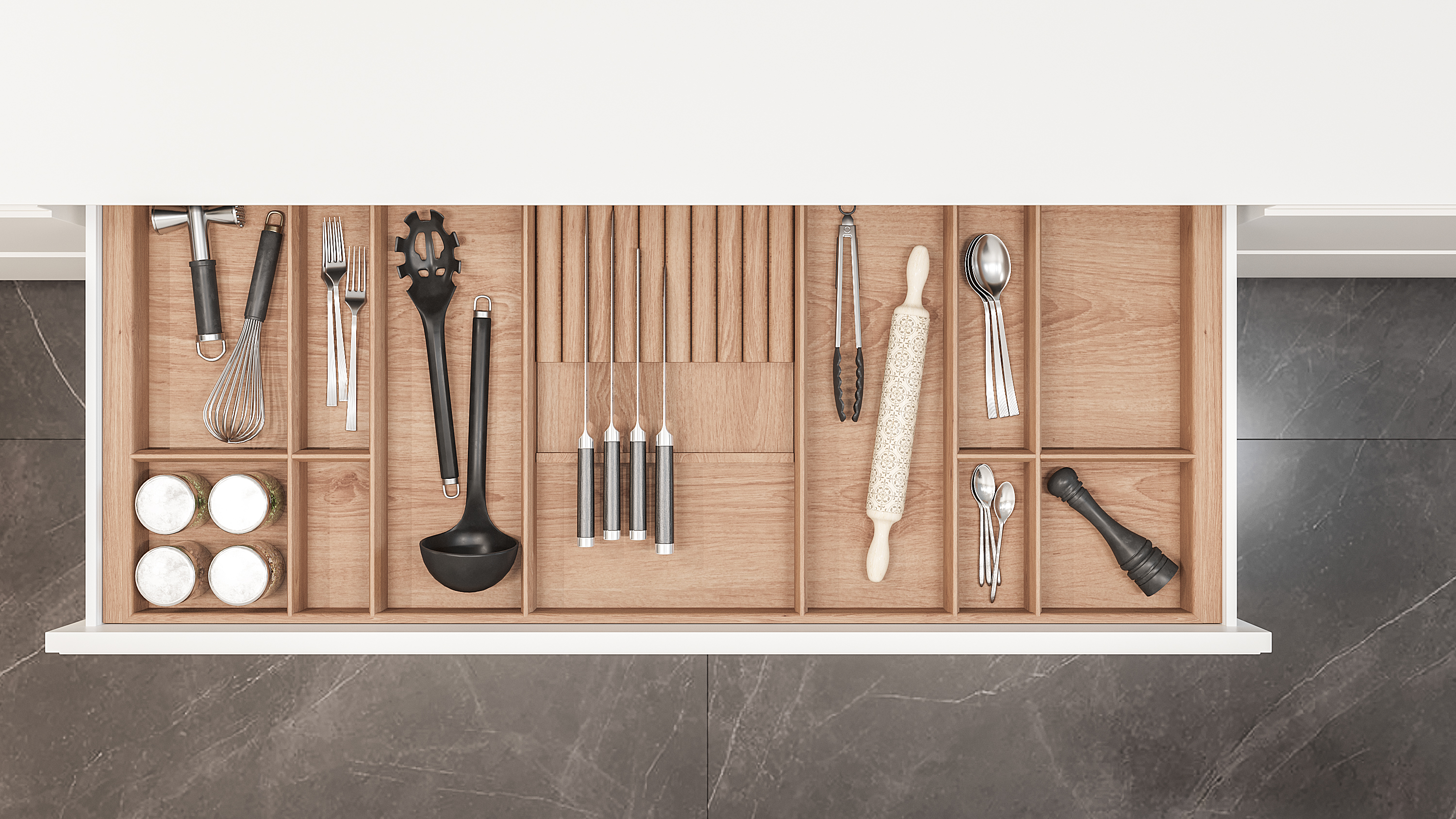 Лоток для столовых приборов в базу 1200 для оснащения низких кухонных ящиков. Элегантный лоток-вкладыш разработан и вручную изготовлен для ящиков разных систем глубиной 500 мм в корпус шириной 1200 мм. Лоток предназначен для хранения столовых приборов и кухонного инвентаря. Вы по желанию можете добавить держатели ножей и специй. Лоток изготовлен из высококачественных материалов безопасных в применении на кухне.