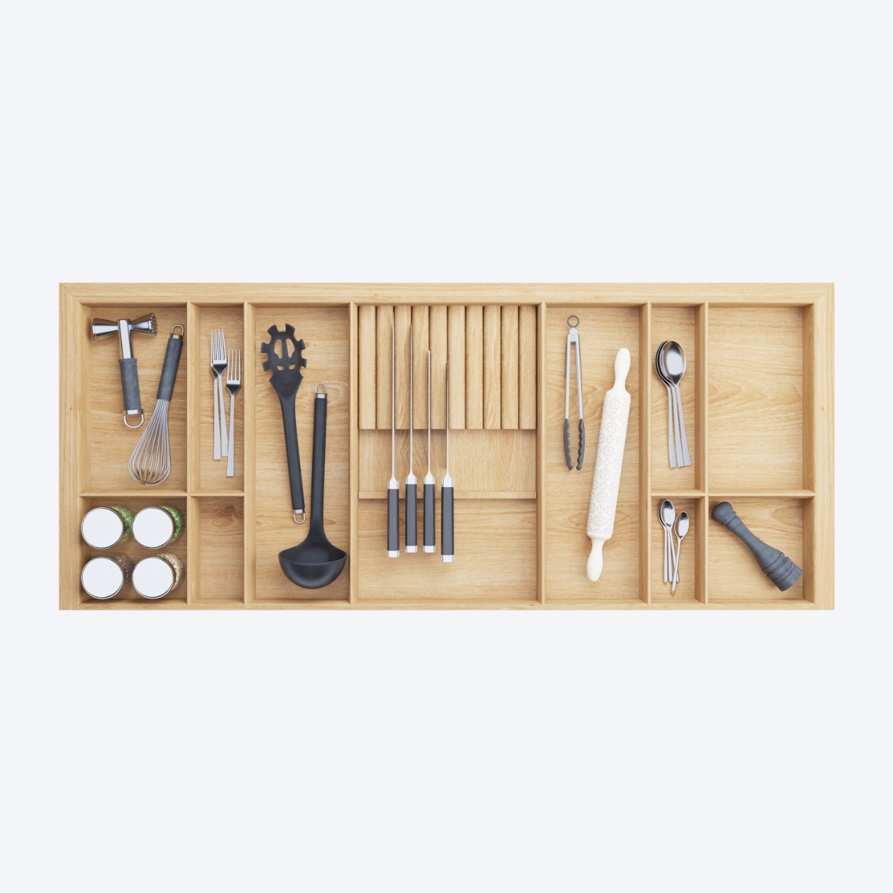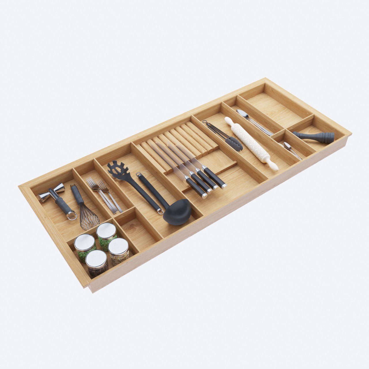 Деревянный лоток TETRIS V4 с держателем 9 ножей из массива дуба для столовых приборов в ящик глубиной 500 мм на ширину фасада 1200 мм. дуб светлый.